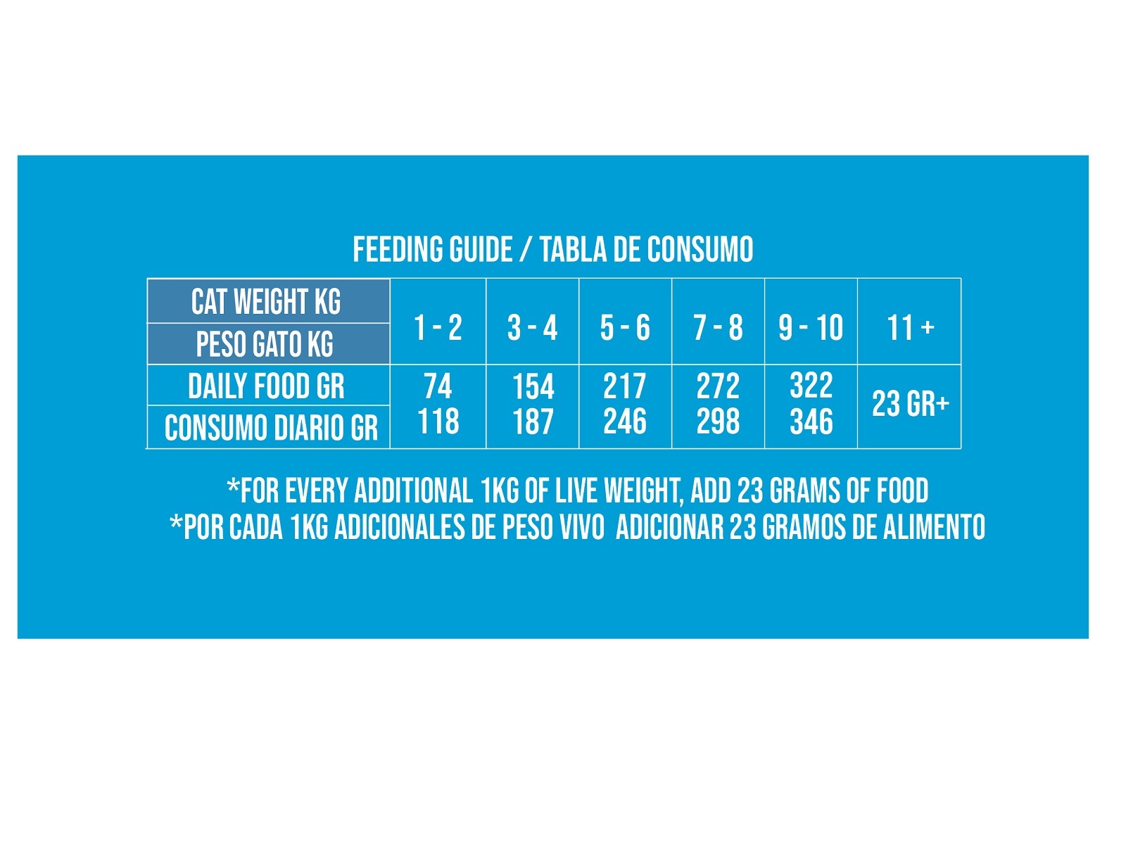 La tabla de dosificación en el empaque está diseñada para gatos adultos. En caso de necesitar el cálculo exacto para gatos cachorros, te podemos ayudar por la línea de atención al cliente. Reemplaza una alimentación seca o la complementa (se puede mezclar).